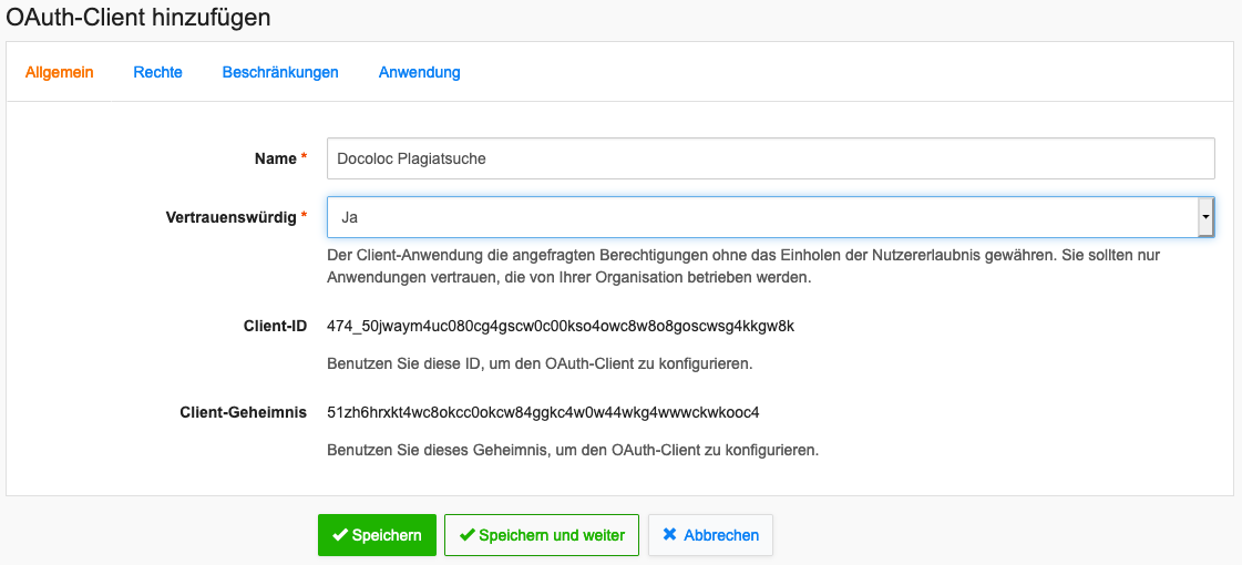 Für den Letzten Schritt der Docol©c Einbindung in das IServ-Portal Ihrer Schule müssen nun die Client-ID und das Client-Geheimnis aus dem ersten Schritt in Docol©c eingegeben werden.