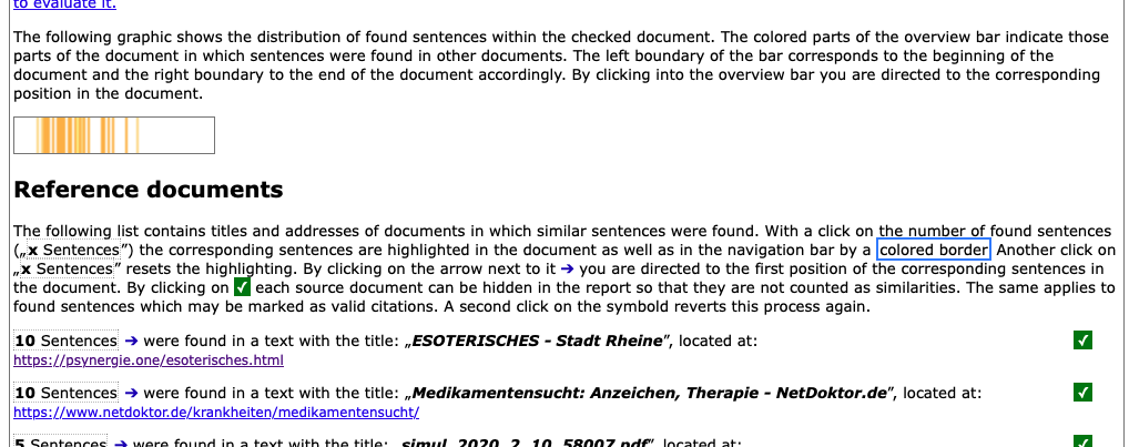 Another header element of the Docol©c-Reports is the overview and navigation bar. It shows the distribution of all sentences found in other documents within the checked document. Below this bar there is a list of reference documents in which the similarities were found. This list is sorted in descending order according to the number of sentences which were found in the documents. For each reference document, this number, the title as well as the Internet address of the document is given. Clicking on the number of sentences of a reference document highlights the associated sentences in the text and in the navigation bar in blue color. Click again to remove the highlighting.